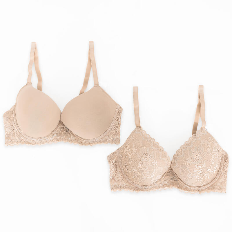 Confezione 2 pezzi reggiseno balconcino in coppa C leggermente imbottita. I due reggiseni sono uno coppa liscia ed uno con coppa in pizzo floreale.