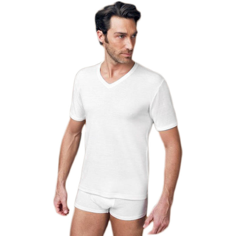 Maglia uomo mezza manica, realizzata in dual Lana e Cotone,che è il risultato dell’unione della lana all’esterno e della parte a contatto con la pelle in cotone, uniti da un filo di nylon. Ciò permette di coniugare l'elevata capacità di assorbenza della lana con la freschezza e la caratteristica di non provocare irritazioni del cotone ed allergie alla lana.