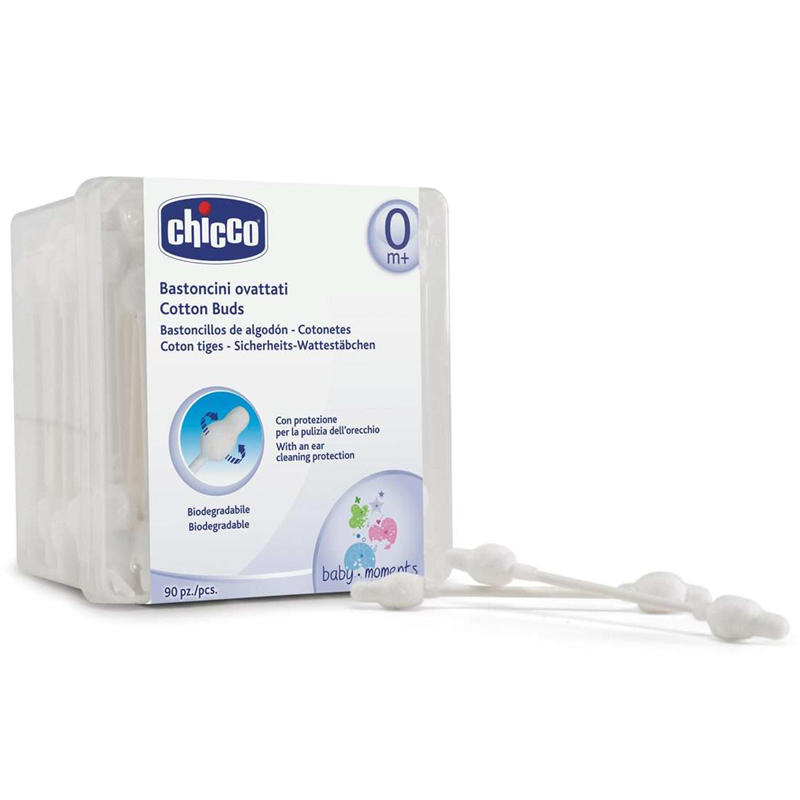 Realizzati al 100% in cotone biodegradabile,i bastoncini ovattati Chicco con protezione per il timpano sono sicuri per il piccolo grazie alle estremità morbide e flessibili.Disponibili nella pratica confezione da 90pz.