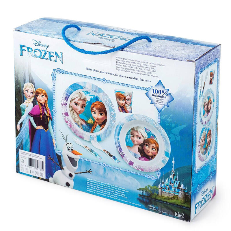 Confezione 5 pezzi in melamina Frozen composta da piatto piano, piatto pappa, bicchiere, cucchiaio, e forchetta
